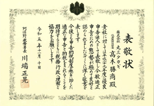 税務面の透明性と地域社会・行政からの信頼を軸にした誠実な経営姿勢が高く評価されました。